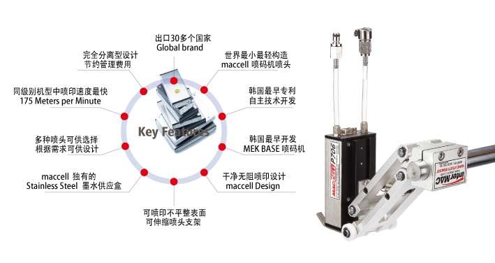 - 100% 韓國專利生產(chǎn),韓國最初被開發(fā)的大字符噴碼機(jī) maccell Drop on Demand (DOD) 。它代表韓國最新技術(shù)的產(chǎn)業(yè)用大字符噴碼機(jī)。maccell DOD Technology 集約型尖端技術(shù)使最小型最輕型設(shè)計(jì)生產(chǎn)成為可能,并且在同級別噴碼速度達(dá)到最高(1分鐘175米)。