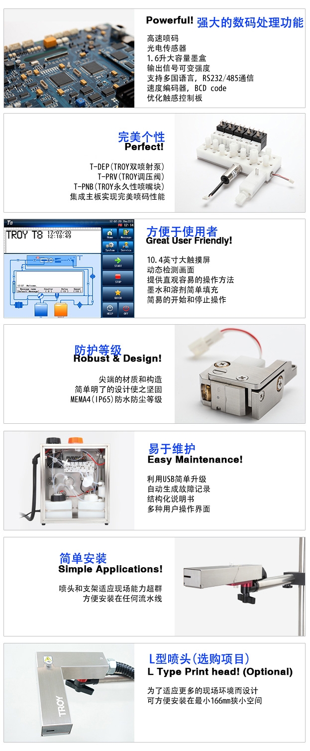 接口和連接 以太網(wǎng)/RS232/RS485, 光電傳感器 BCD速度編碼器 信號輸出,DC 24V 500mA (墨水&溶劑容量低, 系統(tǒng)出錯) 電壓的自由輸出 繼電器輸出 | 系統(tǒng)特征 T-DEP(Troy 雙噴射泵) T-PRV(Troy 調(diào)壓閥) T-PNB(永久性噴嘴座) 墨水控制集成板 容易控制啟動和停止(包括快速停止) 優(yōu)觸感控制板 簡單安全的墨水安裝與續(xù)充 圖標(biāo)按鈕用戶界面 實時動畫展示系統(tǒng)狀態(tài) 圖形創(chuàng)建功能 多個消息屬性保存功能 密碼以及安全機(jī)制 實時,日期,批處理計算和轉(zhuǎn)換代碼打印功能 系統(tǒng)日志記錄和各種錯誤報警功能 數(shù)據(jù)備份和保存功能